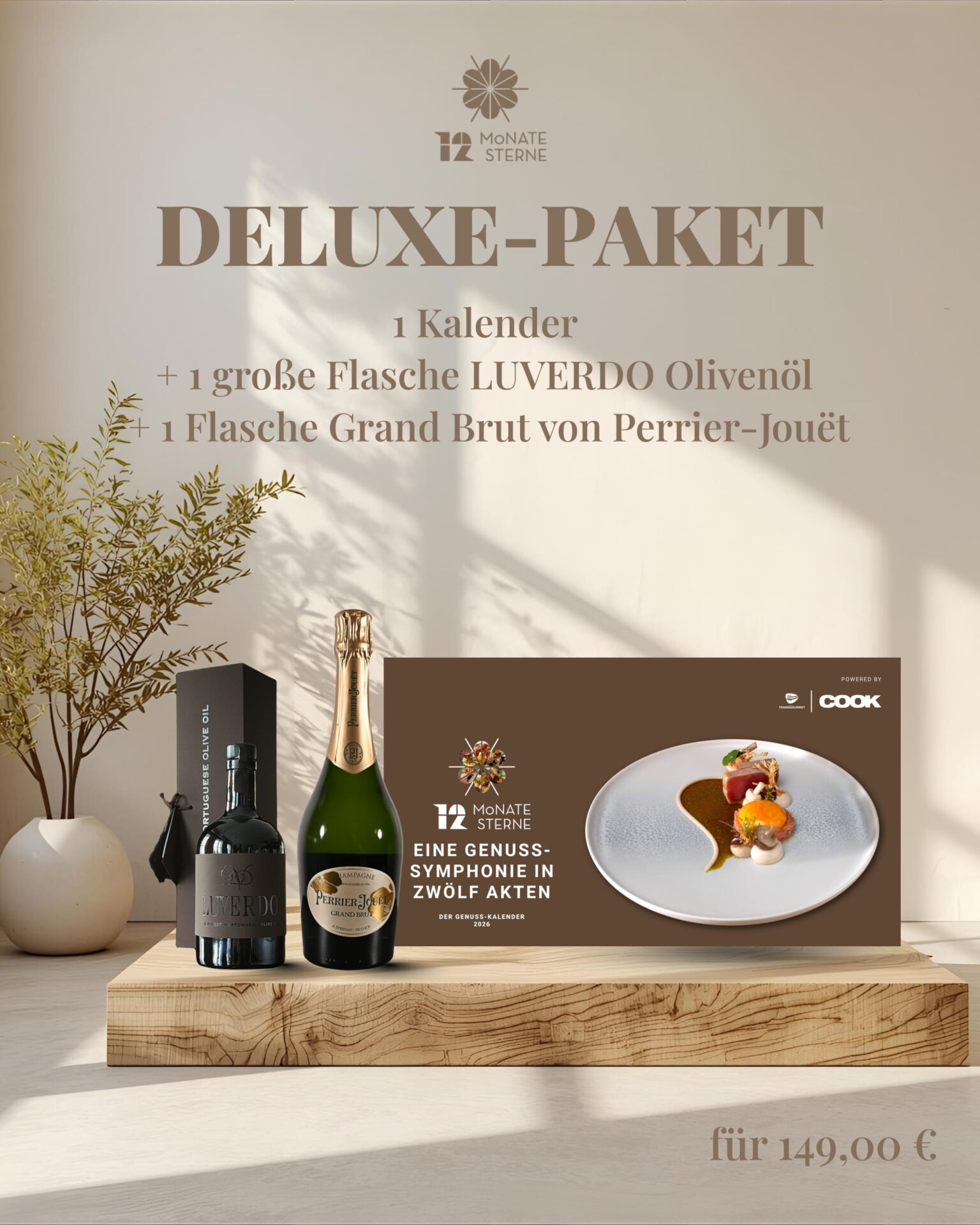 den exklusiven Genusskalender 2026, das LUVERDO Ultra Premium Olivenöl und den Grand Brut Champagner von Perrier-Jouët.