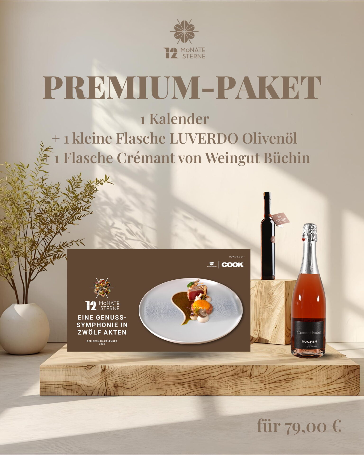 Dieses Paket vereint drei ausgewählte Genusserlebnisse: den exklusiven Genusskalender 2026, eine kleine Flasche LUVERDO Olivenöl und eine Flasche Crémant vom Weingut Büchin.